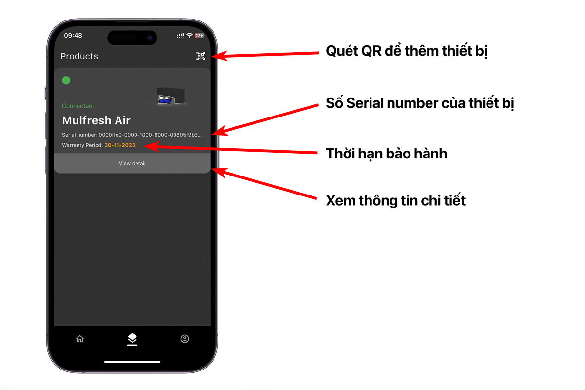- Sau khi mở ứng dụng, chọn tab Sản phẩm, xem trực tiếp thời hạn bảo hành ngay trên thông tin sản phẩm. Nếu ứng dụng không hiển thị thông tin sản phẩm, bạn vui lòng quét mã QR trên hộp đựng thiết bị để đăng ký kích hoạt sản phẩm.