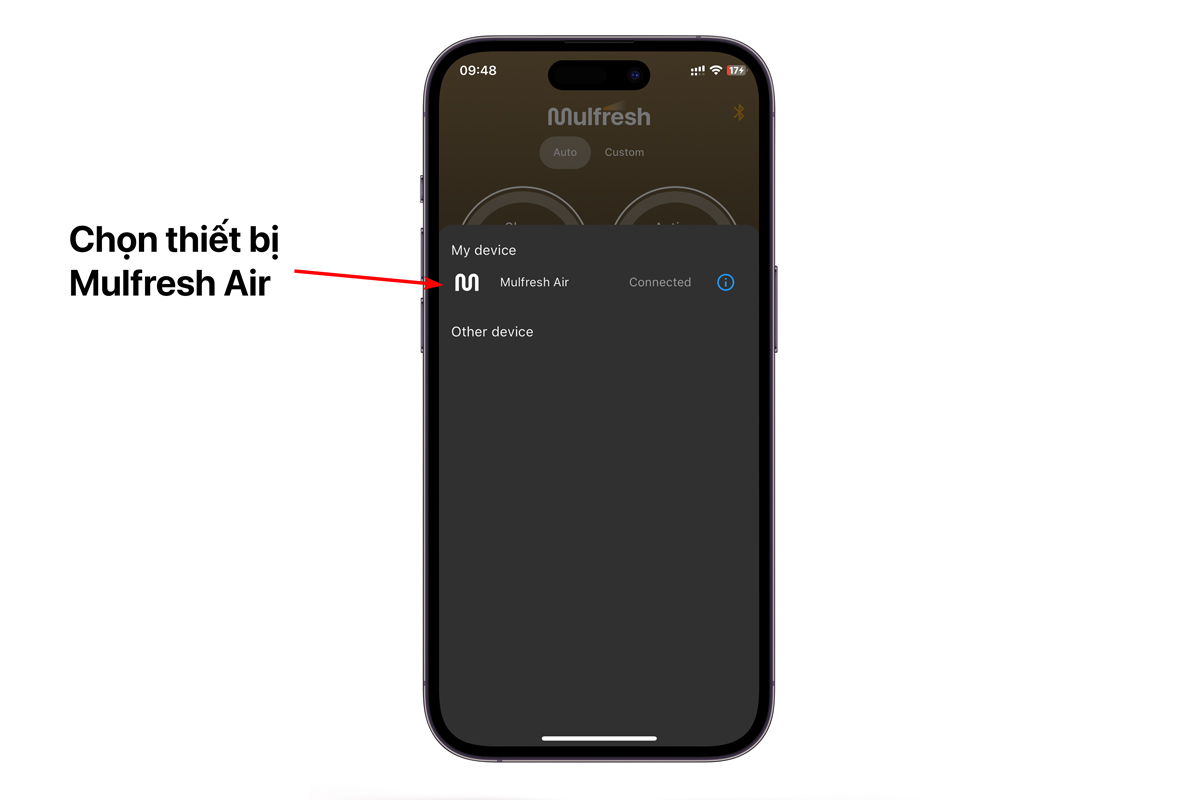 Chọn thiết bị "Mulfresh Air" có trong danh sách. Thiết bị hiển thị trạng thái "Đã kết nối" hoặc "Connected" là thiết ứng dụng đã kết nối với thiết bị thành công.