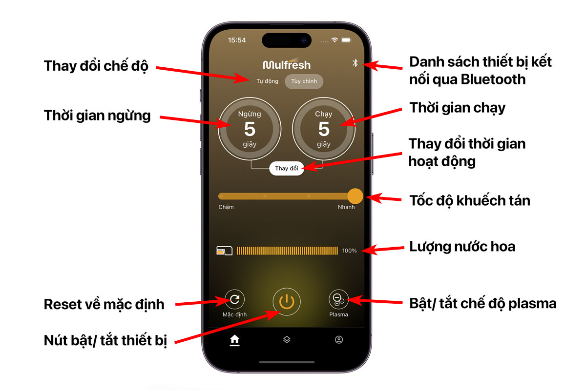 Ứng dụng Mulfresh mang đến cho bạn một trải nghiệm tương tác thông minh cung cấp cho bạn khả năng tùy chỉnh các cài đặt và chế độ hoạt động của thiết bị Mulfresh Air. Bạn có thể điều chỉnh mức độ khuếch tán nước hoa, thời gian hoạt động, và thậm chí lên lịch tự động cho việc tắt và mở thiết bị. Điều này giúp bạn tạo ra một không gian thơm ngát theo sở thích cá nhân của mình.